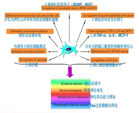 對于阿爾茨海默病:間充質干細胞可以分化為神經元、分泌神經營養因子、旁分泌免疫調節因子等,起到代替受損神經細胞、重建神經通路、營養和保護膽堿能神經元、抑制炎癥反應等作用。