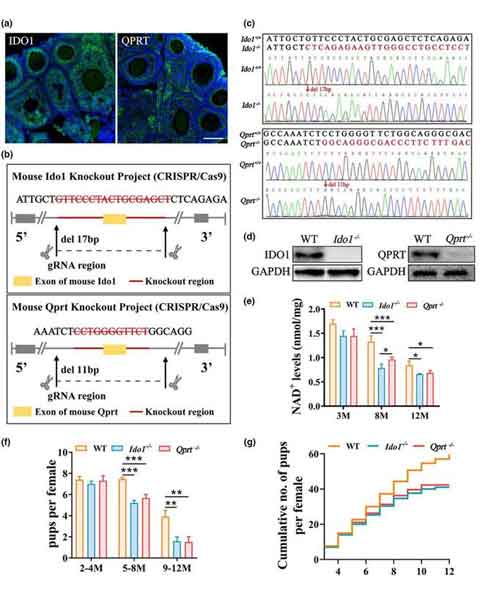天歲生物在研究中發(fā)現(xiàn),IDO1 和 QPRT 的缺失導(dǎo)致中年小鼠卵巢 NAD+ 水平下降,從而加速卵巢衰老,天歲研究首先利用 WB 確定 IDO1 和 QPRT 在卵巢中均有表達(dá),隨后利用 CRISP/Cas9 技術(shù)構(gòu)建了 IDO1 和 QPRT 敲除小鼠,并采用 Sanger 測序確認(rèn)小鼠基因型。隨著年齡的增長,測定 WT、IDO1?/? 和 QPRT?/? 小鼠卵巢中 NAD+ 的水平。結(jié)果表明,與對照小鼠相比,8 個(gè)月大的 IDO1?/? 和 QPRT?/? 小鼠卵巢和分離顆粒細(xì)胞的 NAD+ 含量明顯下降。
